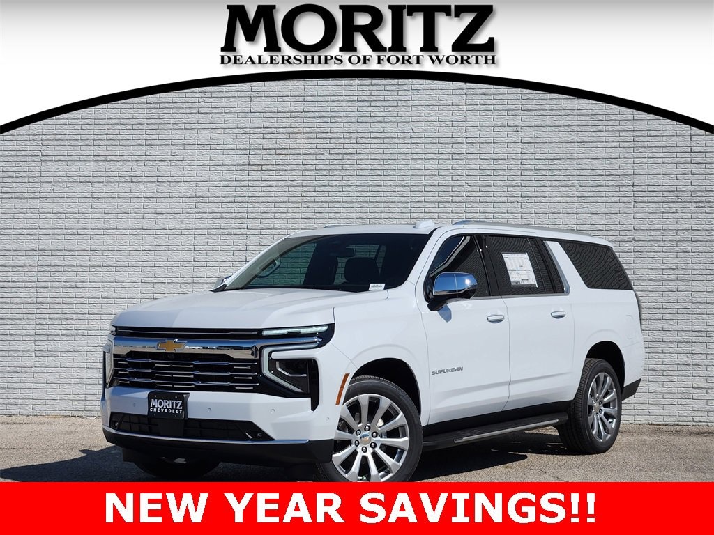 Polar White 2026 Chevrolet Suburban Premier 4WD 10-Speed Automatic with Overdrive EcoTec3 5.3L V8 Bluetooth, Backup Camera, 10 Speakers, 2-Speed Active Electronic AutoTrac Transfer Case, 3rd Row 60/40 Power-Folding Split-Bench, 3rd row seats: split-bench, 4-Way Power Driver Lumbar Seat Adjuster, 4-Way Power Front Passenger Lumbar Seat Adjuster, 8-Way Power Driver Seat Adjuster, 8-Way Power Front Passenger Seat Adjuster, Advanced Trailering Package, AM/FM radio: SiriusXM with 360L, Auto-Dimming Inside Rear-View Mirror, Chrome Mirror Caps, Dual Exhaust System, Dual-Pane Power Panoramic Sunroof, Exterior Parking Camera Rear, Front Bucket Seats, Front Center Armrest, Front dual zone A/C, Front LED Fog Lamps, Heated 2nd Row Outboard Seats, Heated front seats, Heated Power-Adjustable Outside Mirrors, Heated rear seats, Heated Steering Wheel, Hill Descent Control, Integrated Trailer Brake Controller, Interior Camera, LED Tail Lamps, License Plate Front Mounting Package, Max Trailering Package, Memory seat, Memory Settings, Navigation system: Google built-in compatibility (select service plan required, terms and limitations apply), Perforated Leather Seating Surfaces, Power driver seat, Power Liftgate, Power passenger seat, Power Release 2nd Row Bucket Seats, Power steering, Power windows, Power-Sliding Center Floor Console, Preferred Equipment Group 1LZ, Radio data system, Radio: 17.7 Diagonal Advanced Color LCD Display, Rear air conditioning, Rear Power Liftgate, Rear window defroster, Remote keyless entry, Smart Trailer Integration Indicator, Split folding rear seat, Steering wheel memory, Steering wheel mounted audio controls, Turn signal indicator mirrors, Universal Home Remote, Ventilated front seats, Wireless Apple CarPlay/Wireless Android Auto, Wireless Phone Charging.