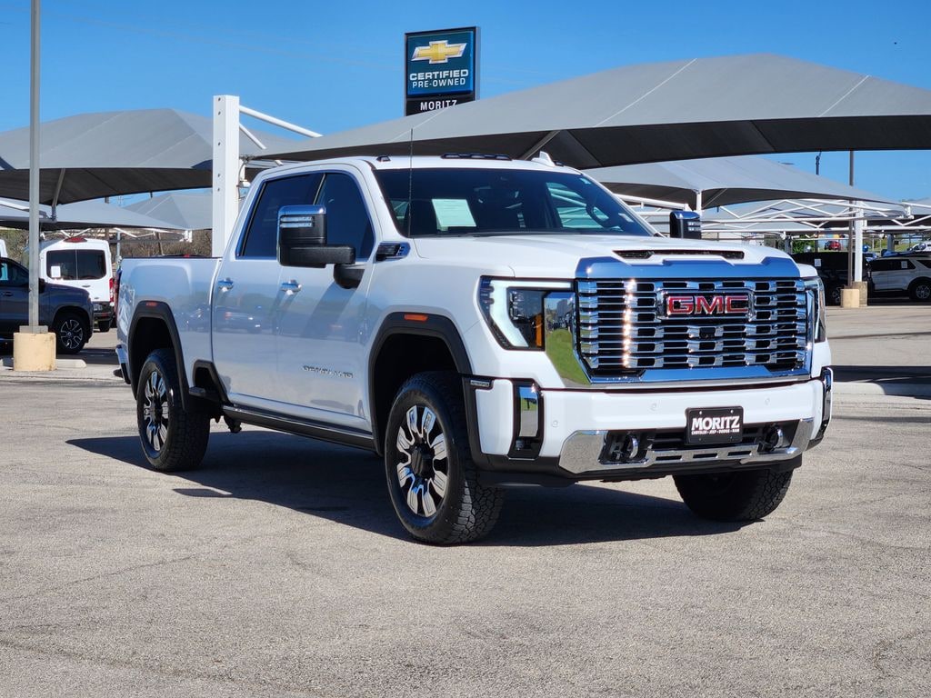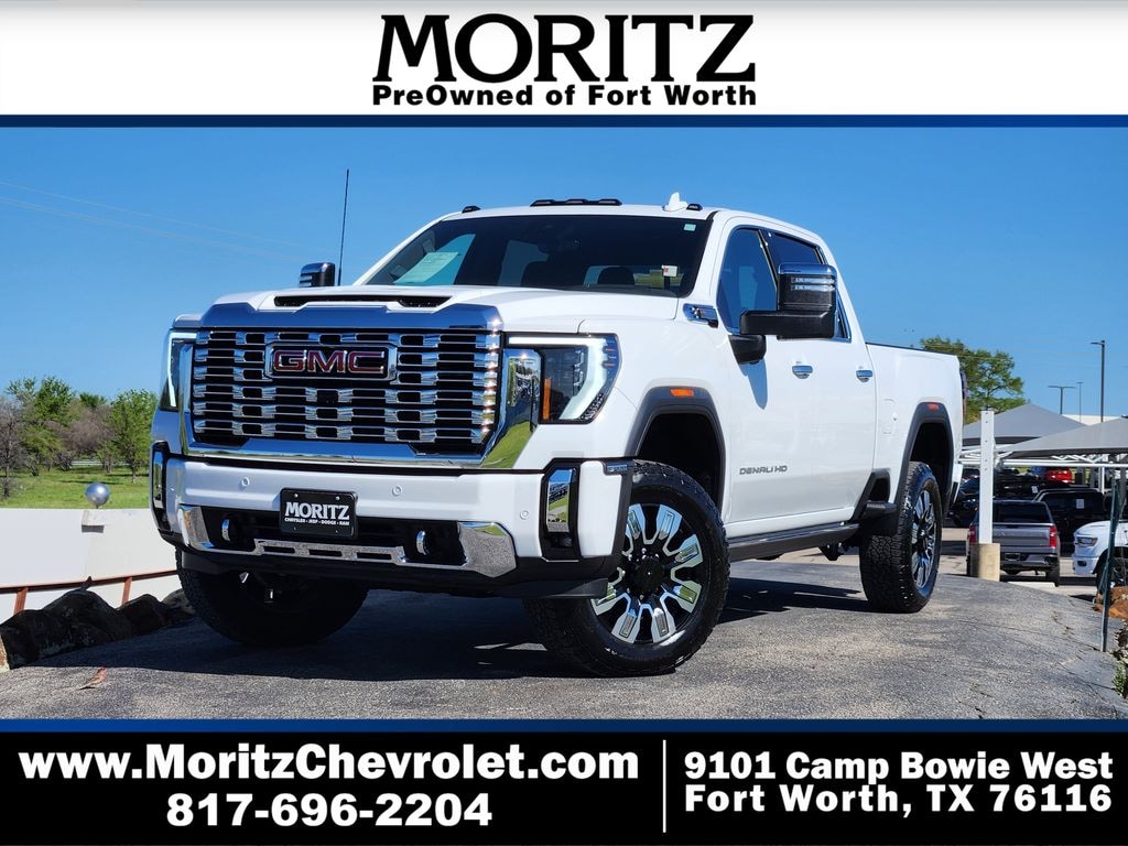 Summit White 2025 GMC Sierra 2500HD Denali 4WD 10-Speed Automatic 6.6L V8 Bluetooth, Backup Camera, The Moritz Promise LIMITED LIFETIME POWERTRAIN PROTECTION PLAN See dealer for details, 10-Speed Automatic, 4WD, Atmosphere/Brownstone Leather, 12-Way Power Driver Seat Adjuster w/Lumbar, 12-Way Power Passenger Seat Adjuster w/Lumbar, 120-Volt Bed Mounted Power Outlet, 120-Volt Instrument Panel Power Outlet, 2 Charge-Only Rear USB Ports, 2 Charge/Data USB Ports Inside Center Console, 2 USB Ports, 2-Speed Active Transfer Case, Apple CarPlay/Android Auto, Auto-dimming Rear-View mirror, Bed View Camera w/2 Trailer Camera Provisions, Bose Premium 7-Speaker Sound System, Brake assist, Deep-Tinted Glass, Denali Reserve Package, Electric Rear-Window Defogger, Electronic Stability Control, Floor-Mounted Center Console, Following Distance Indicator, Forge Perforated Leather-Appointed Front Seat Trim, Front anti-roll bar, Front Rain-Sensing Wipers, Front wheel independent suspension, Fully automatic headlights, Garage door transmitter, Genuine wood dashboard insert, Genuine wood door panel insert, HD Surround Vision, Heated 2nd Row Outboard Seats, Heated Driver & Front Outboard Passenger Seats, Hill Descent Control, Hitch Guidance w/Hitch View, Illuminated entry, Inside Rearview Auto-Dimming Rear Camera Mirror, Keyless Open & Start, Lane Departure Warning System, LED Cargo Area Lighting, LED Smoked Amber Roof Marker Lamps, Manual Tilt-Wheel/Telescoping Steering Column, Multicolor 15" Diagonal Head-Up Display, Off-Road Suspension, OnStar Services Capable, Polished Exhaust Tip, Power Front Passenger Windows w/Express Up/Down, Power Sliding Rear Window w/Defogger, Power Sunroof, Preferred Equipment Group 5SA, Push Button Start, Rear Cross Traffic Alert, Rear step bumper, Rear Wheelhouse Liners, Remote Vehicle Starter System, Safety Alert Seat, Security system, Signature Chrome Denali Grille, SiriusXM w/360L Trial Subscription, Speed-sensing steering, Spray-On Pickup Bedliner w/GMC Logo, Steering Wheel Audio Controls, Steering wheel mounted audio controls, Technology Package, Traction control, Trailer Cam Provisions & Trailer Viewing Software, Trailer Side Blind Zone Alert, Ultrasonic Front & Rear Park Assist, Unauthorized Entry Theft-Deterrent System, Universal Home Remote, Ventilated Driver & Front Passenger Seats, Wireless Charging, Wireless Phone Projection, X31 Off-Road Package.