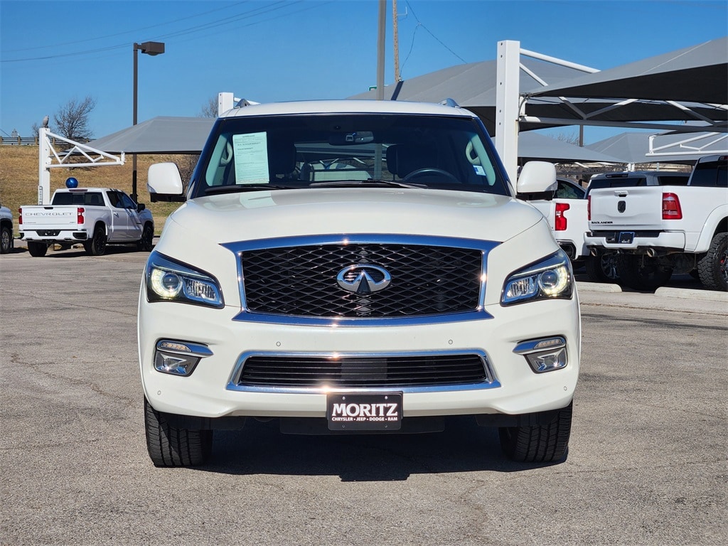 Majestic White 2016 INFINITI QX80 4WD 7-Speed Automatic 5.6L V8 Bluetooth, Backup Camera, 120V Power Outlet, 13 Speakers, 3rd row seats: split-bench, Alloy wheels, Auto-dimming Rear-View mirror, Auto-leveling suspension, Automatic temperature control, Backup Collision Intervention (BCI), Blind Spot Warning, Driver's Assistance Package, Dual 7" Color Monitors, Electronic Stability Control, Four wheel independent suspension, Fully automatic headlights, Garage door transmitter: HomeLink, Genuine wood console insert, Genuine wood dashboard insert, Genuine wood door panel insert, Heated 2nd-Row Seats, Heated Front Bucket Seats, Illuminated entry, Intelligent Cruise Control (Full-Speed Range), Lane Departure Warning System, Leather steering wheel, Leather-Appointed Seats w/Mocha Burl Trim, Memory seat, Navigation System, Power moonroof, Rear air conditioning, Reclining 3rd row seat, Security system, Speed-sensing steering, Spoiler, Steering wheel mounted audio controls, Telescoping steering wheel, Theater Package, Traction control, Wireless Headphones (2).