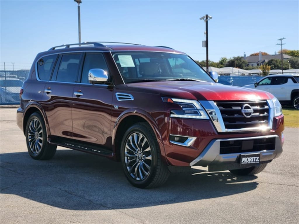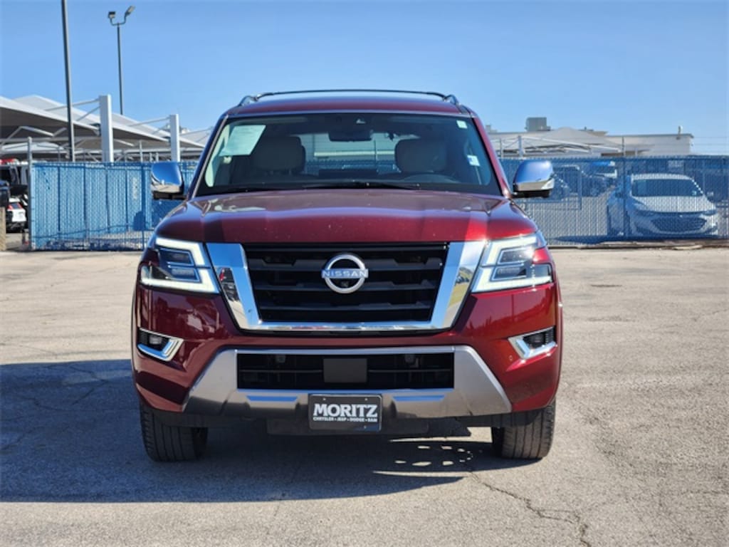 Coulis Red Pearl 2021 Nissan Armada Platinum RWD 7-Speed Automatic 5.6L V8 DOHC 32V LEV3-ULEV125 400hp Bluetooth, Backup Camera, The Moritz Promise LIMITED LIFETIME POWERTRAIN PROTECTION PLAN See dealer for details, 13 Speakers, 2nd Row Captain's Chairs, 2nd Row Center Console w/Padded Armrest, 3rd Row Carpeted Floor Mats - Captain Seat, Alloy wheels, Auto-leveling suspension, Automatic temperature control, Brake assist, Captain's Chairs Package, Cross Bars, Electronic Stability Control, Exterior Parking Camera Rear, Four wheel independent suspension, Front anti-roll bar, Front fog lights, Fully automatic headlights, Garage door transmitter: HomeLink, Heated front seats, Illuminated entry, Illuminated Kick Plates, Illuminated Scuff Plate, Memory seat, Navigation System, NissanConnect featuring Apple CarPlay and Android Auto, Power Liftgate, Power moonroof, Quilted Leather Seat Trim, Rear air conditioning, Reclining 3rd row seat, Security system, Speed-sensing steering, Spoiler, Steering wheel memory, Steering wheel mounted audio controls, Telescoping steering wheel, Traction control.