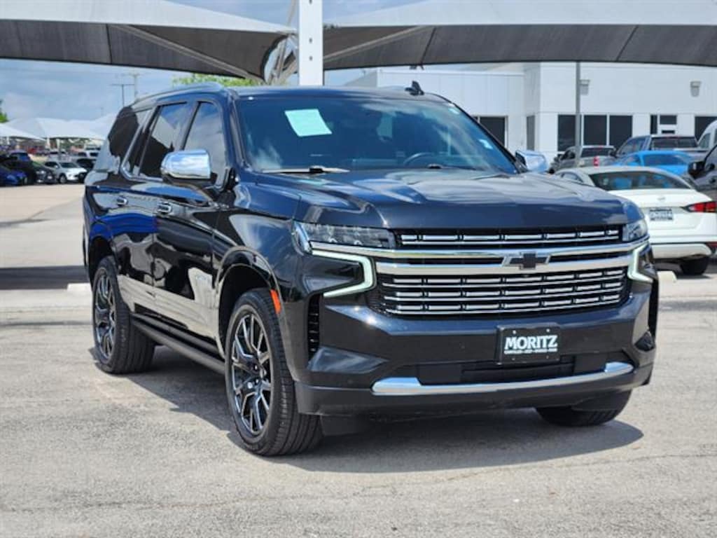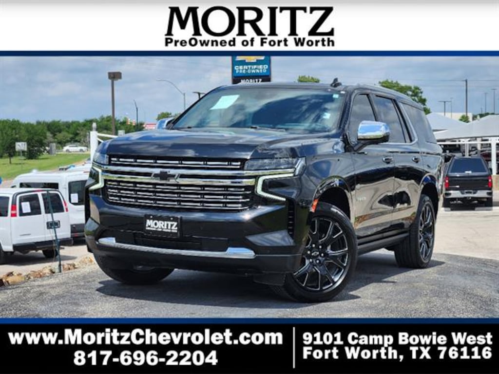 Certified. Black 2023 Chevrolet Tahoe Premier 4WD 10-Speed Automatic with Overdrive EcoTec3 5.3L V8 Bluetooth, Backup Camera, The Moritz Promise LIMITED LIFETIME POWERTRAIN PROTECTION PLAN See dealer for details, 4WD, Black Leather, 10 Speakers, 15" Diagonal Multi-Color Head-Up Display, 1st & 2nd Row Color-Keyed Carpeted Floor Mats, 2-Speed Active Electronic AutoTrac Transfer Case, 3rd Row 60/40 Power-Folding Split-Bench Seat, Adaptive suspension, Apple CarPlay/Android Auto, Auto-Dimming Inside Rear-View Mirror, Auto-leveling suspension, Automatic temperature control, Bose 10-Speaker Centerpoint Surround Audio Sys Ft, Brake assist, Bright Front & Rear Door Sill Plates, Chrome Door Handles w/Body-Color Strip, Chrome Mirror Caps, Color-Keyed Carpeting Floor Covering, Driver & Front Outboard Passenger Airbags, Dual Exhaust System, Dual-Pane Power Panoramic Sunroof, Electronic Stability Control, Enhanced Display & Alert Package, Enhanced Driver Information Center, Floor Console, Front anti-roll bar, Front High-Back Reclining Bucket Seats, Fully automatic headlights, Garage door transmitter, Hands-Free Rear Power Programmable Liftgate, HD Surround Vision, Heated & Ventilated Driver & Front Passenger Seats, Heated 2nd Row Outboard Seats, Heated Driver & Front Passenger Seats, Heated Steering Wheel, Hill Descent Control, Illuminated entry, Infotainment Display, Inside Rearview Auto-Dimming Rear Camera Mirror, Lane Change Alert w/Side Blind Zone Alert, LED Daytime Running Lamps, Magnetic Ride Control Suspension, Memory Settings, Navigation System, Outside Heated Power-Adjustable Mirrors, Perforated Leather Seat Trim, Power Liftgate, Power Release 2nd Row Bucket Seats, Power Tilt & Telescopic Steering Column, Preferred Equipment Group 1LZ, Rear air conditioning, Rear Camera Mirror Washer, Rear Cross Traffic Alert, Rear Pedestrian Alert, Remote keyless entry, Remote Start, Safety Alert Seat, Security system, SiriusXM Radio w/360L, Speed-sensing steering, Spoiler, Steering wheel mounted audio controls, Telescoping steering wheel, Universal Home Remote, Wireless Charging, Wrapped Steering Wheel. Certification Program Details: 126-point inspection. Vehicle must be 10 model years old or newer, and the vehicle must have under 100,000 miles at the time of sale. Comes with 12 month/12,000 mile limited bumper to bumper warranty.