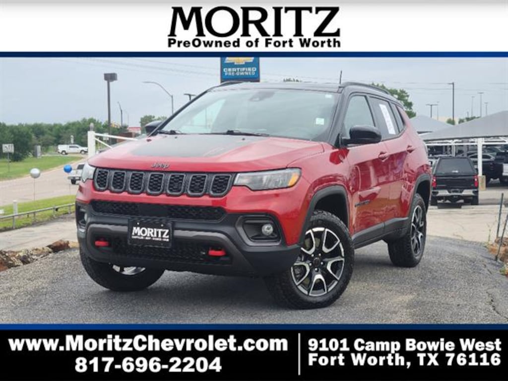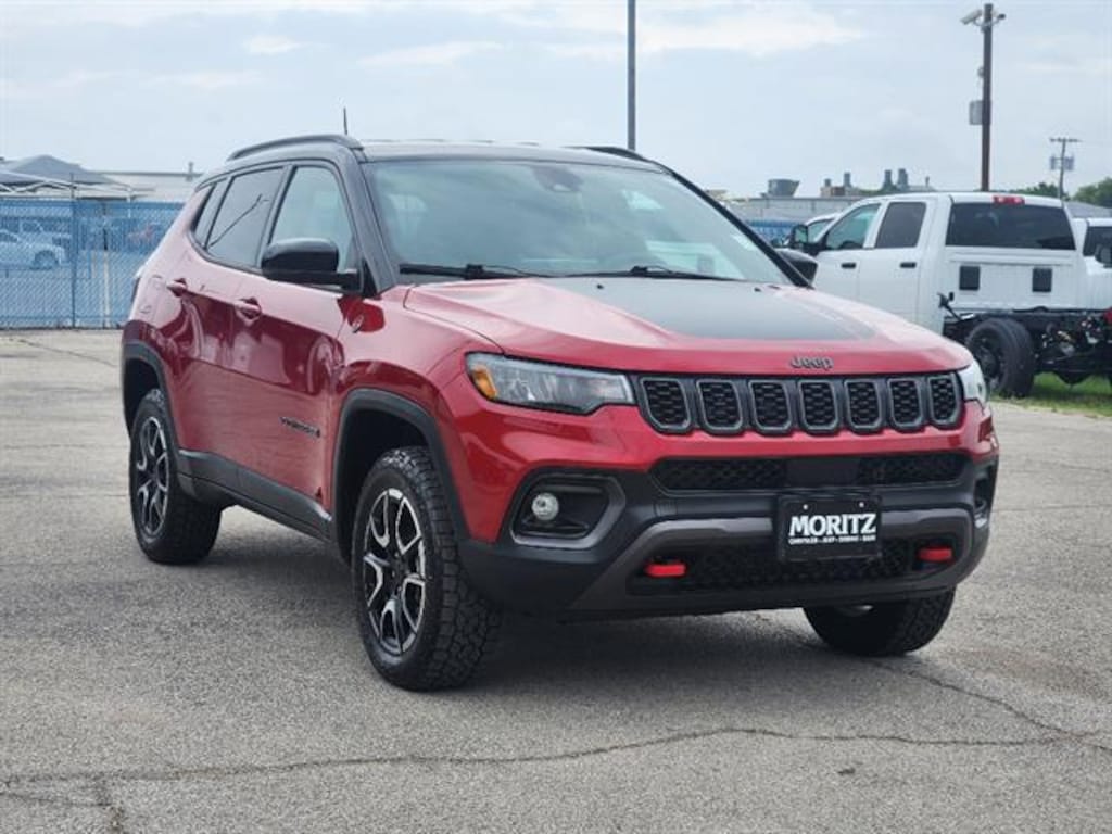 Experience adventure and capability with this striking Red 2025 Jeep Compass Trailhawk 4x4 SUV. Built to tackle any terrain, it features an off-road tuned suspension, rear locking differential, hill descent assist, front and rear skid plates, and all-terrain 4WD with drive mode selector. Stay connected and informed with a 10.1-inch Uconnect touchscreen, wireless Apple CarPlay/Android Auto, Amazon Alexa compatibility, and SiriusXM Guardian. Enjoy safety and peace of mind with adaptive cruise control, front automatic emergency braking with pedestrian detection, lane keeping assist, blind spot monitoring, rear cross-traffic alert, and a rearview camera. Comfort and style come with leather-trimmed upholstery, heated side mirrors, leatherette steering wheel, customizable digital instrument cluster, and dual-zone automatic climate control. Functional features include black roof rails, tow hooks, remote proximity entry, and a push-button start. The Compass Trailhawk is ready for your next journey-see it today and discover why it's the perfect blend of ruggedness, technology, and comfort.
